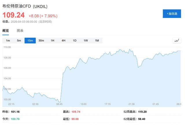 受美以联盟与伊朗持续五周的武装冲突影响,国际油价剧烈震荡,上月一度攀升至每桶近120美元。航空燃油和柴油等成品油价格大幅上涨,市场对新一轮通胀压力的担忧持续升温。上周五,在特朗普宣誓将进一步升级战争后,布伦特原油期货收盘价回落至每桶109美元附近。